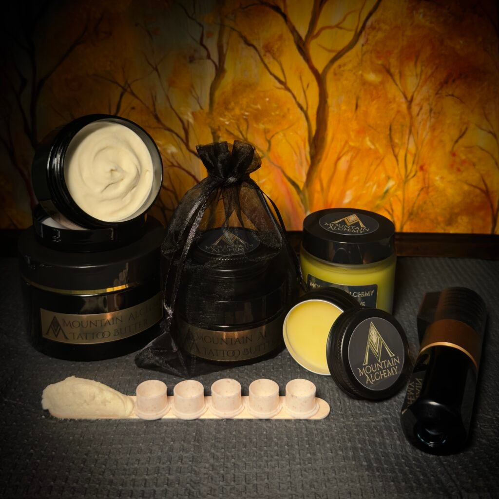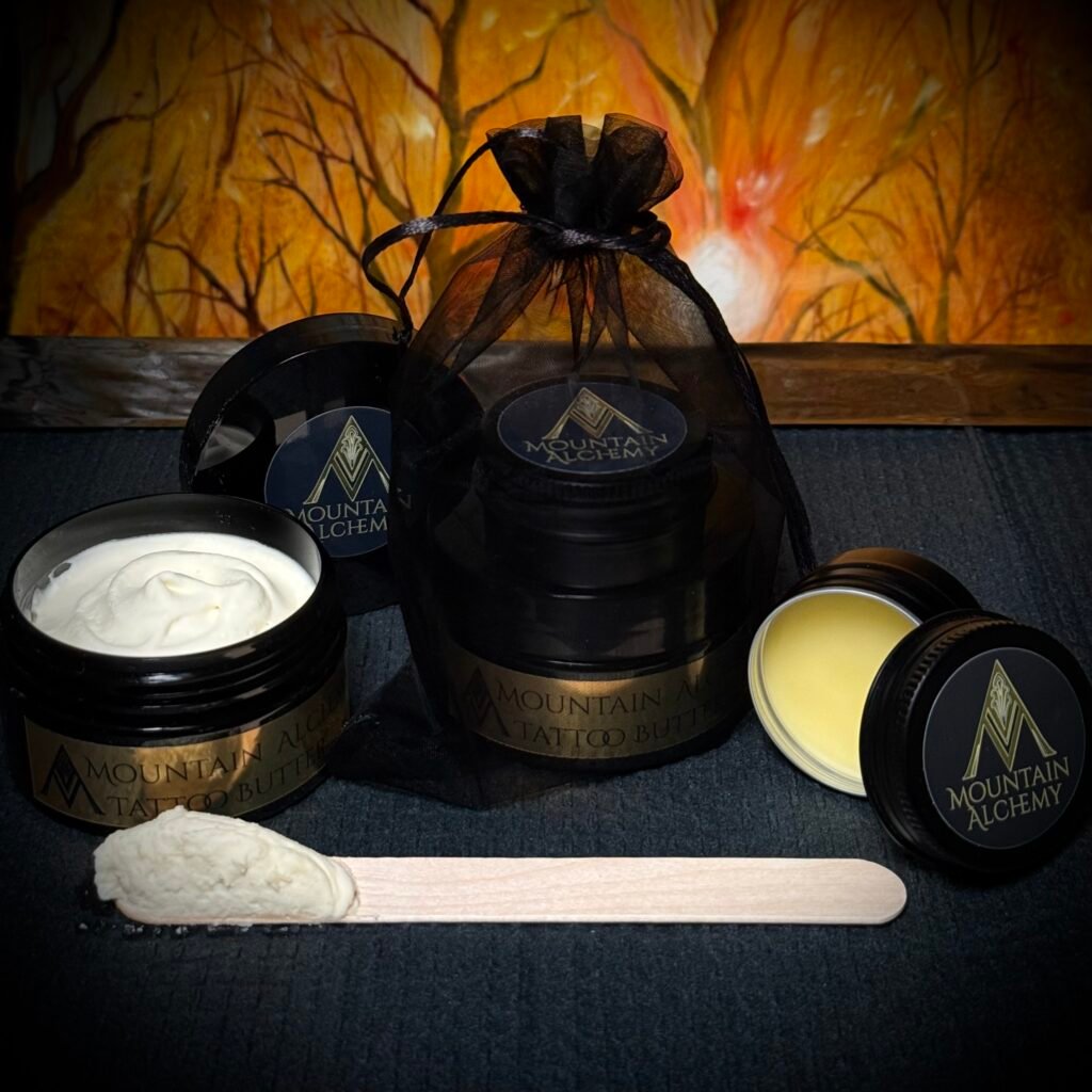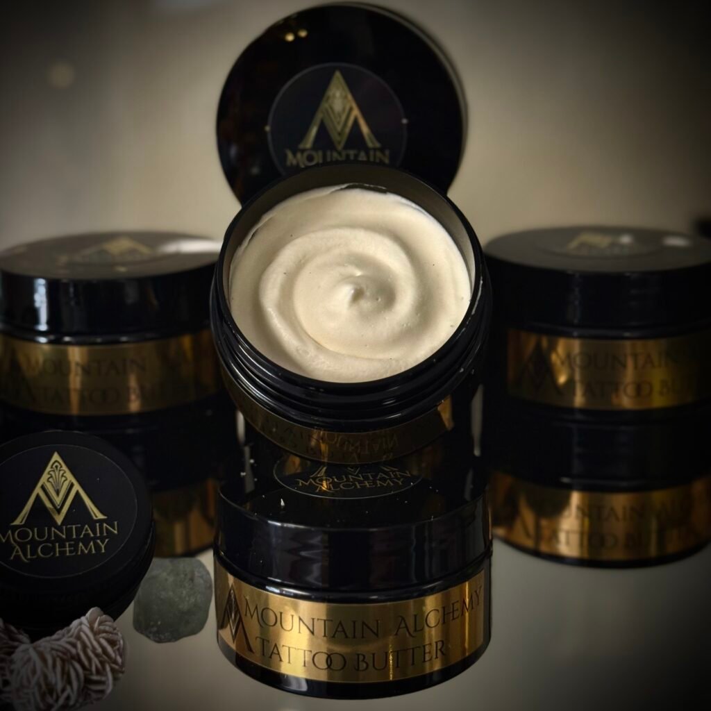 OUR NEWEST BABE! Mountain Alchemy Butter & Glide. Our butter is specifically aimed for your “Stage 2” in healing, when your skin starts to do that snake like shedding, we recommend you switch from our salve to the Butter. Mountain Alchemy Butter is the most lushest product we have ever used to moisturize peeling skin, aimed to lock in much needed moisture as the skin is drying out faster then the Mohave desert. Why do we mention the word Glide? Because not only is it a stage two in healing, but Mountain Alchemy Butter also serves as a premium tattoo glide for artists during the tattooing process. Its smooth, nourishing texture mimics the body’s natural oils, allowing ink to flow effortlessly into the skin without disruption.